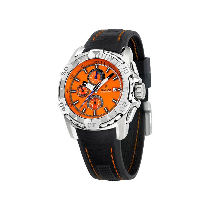 Mens Calendar Date Watch With Round Orange Dial And Black Leather Band.